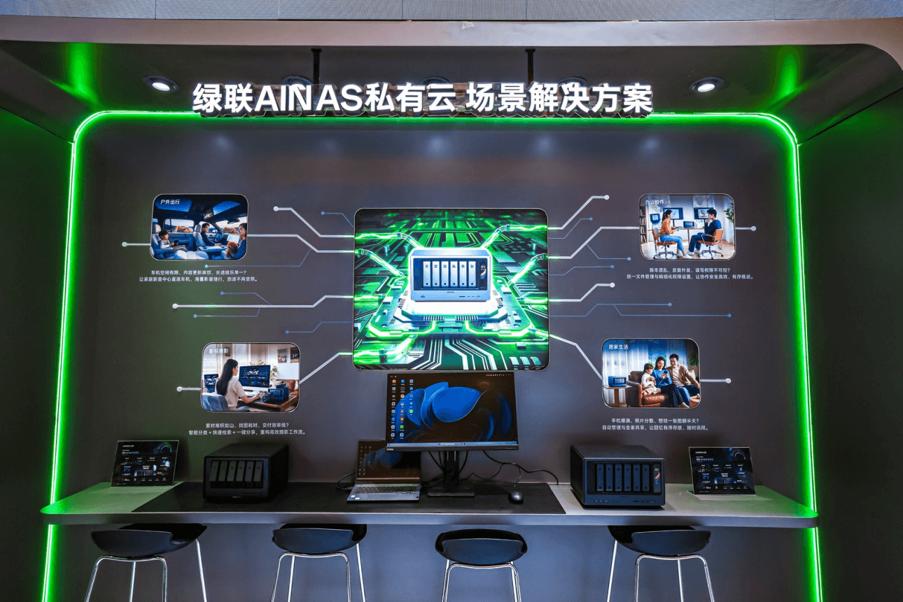智能存储应用生态区落地绿联AI NAS私有云的全场景解决方案:数据安全存储与解决方案区聚焦办公协作、户外出行、居家生活、影视摄影四大高频场景,依托本地算力实现自定义对话、AI相册智能管理、内容精准搜索、Uliya AI助手对话交互等强大功能,数据本地处理筑牢数据安全防线。